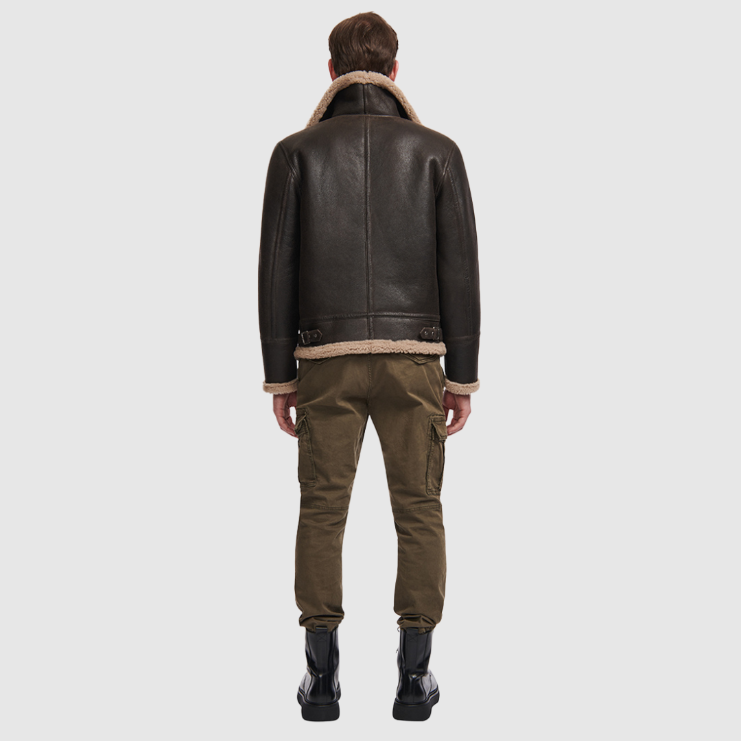 The Ariel Brown Shearling Aviator Jacket channels classic aviator style with a modern update, crafted from supple nappa leather and lined with curly wool shearling. Featuring a curly wool collar and trims, oversized welt pockets with stitch detailing, and adjustable buckle details at the collar and waistband, it combines utility with timeless edge. A standard zip closure ensures functionality, while the structured silhouette offers a confident, versatile fit.