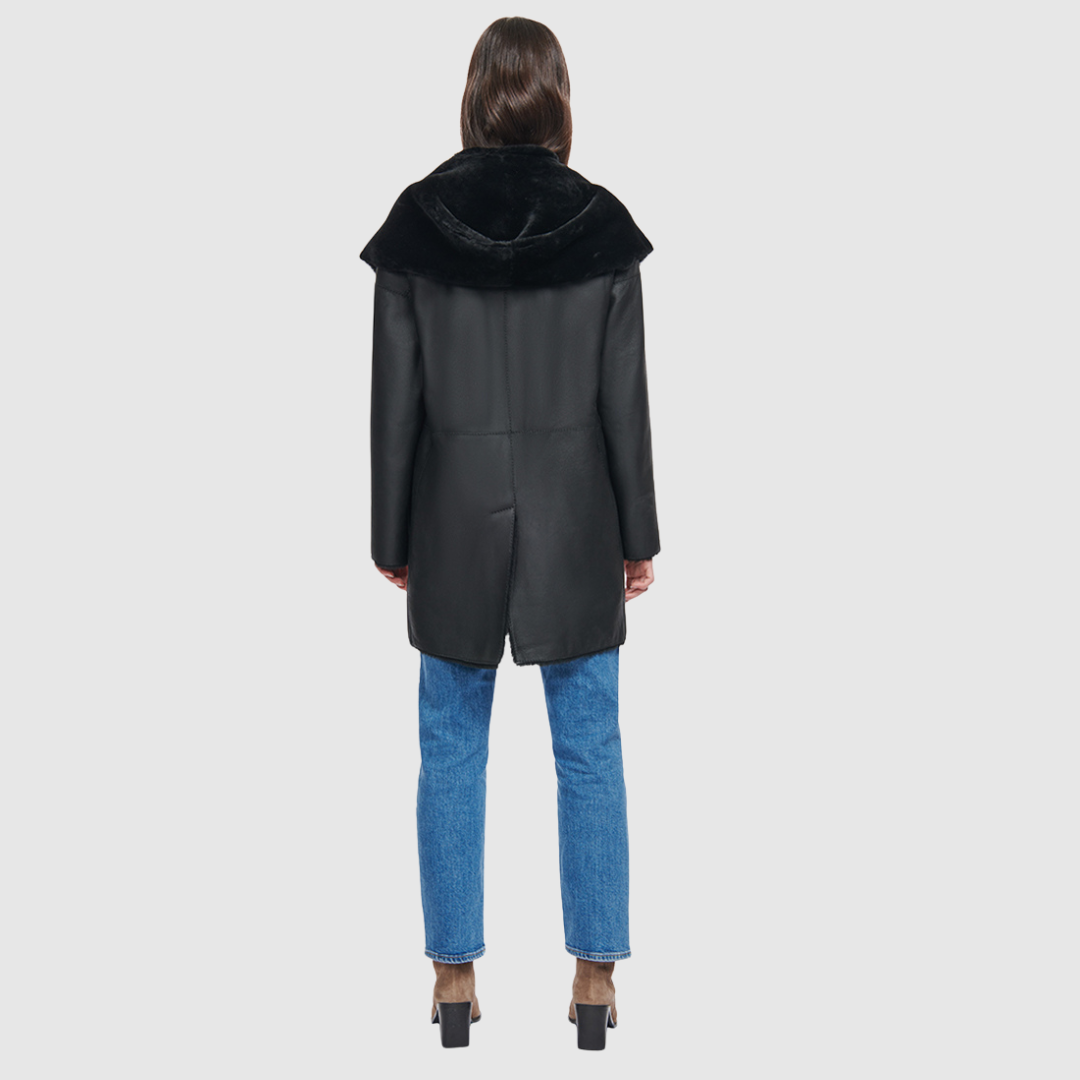 The BAYLIE Reversible Shearling Jacket is a statement in modern versatility and effortless luxury. Crafted in jet-black nappa that reverses to plush ironed wool, it offers two distinct looks in one oversized silhouette. An oversized hood that converts to a dramatic shawl collar adds functional elegance, while raw-edge finishing underscores its contemporary appeal. Designed with drop shoulders and pull-through pockets, BAYLIE moves seamlessly between heritage inspiration and après-ski sophistication.