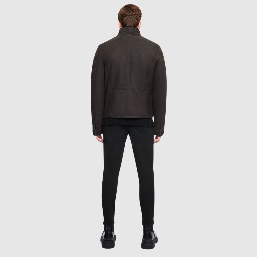 The Brett Guinness Shearling Moto is a refined take on the classic moto jacket, crafted in semi-suede with subtle ribbed sleeve detailing for a modern edge. Its regular shoulder and comfortable fit through the arms and chest allow ease of movement without sacrificing sharpness. A zip stand collar and sleek zip closures at both the front and pockets underscore its streamlined, utilitarian design. Balancing rugged durability with polished minimalism, BRETT is a timeless outerwear statement.
