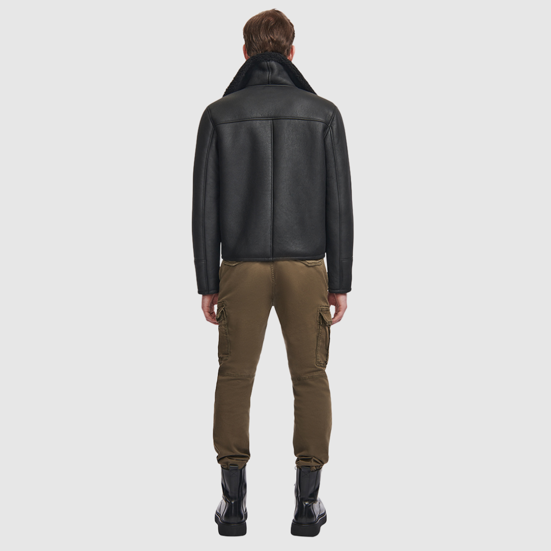The Code Black Shearling Moto is a bold reinterpretation of a classic moto jacket, merging sleek nappa leather with plush curly wool shearling. Designed for a true-to-size fit, it features a spread collar with a buckle detail for added edge, a standard front zip closure, and an interior zip pocket for functionality. This piece balances rugged refinement with modern versatility, making it a cold-weather essential.