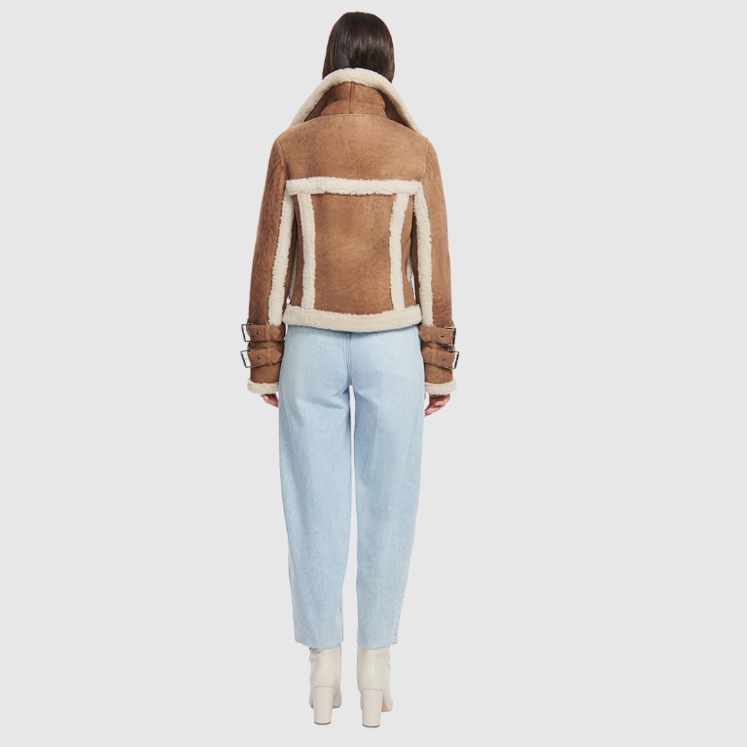 The DOLL Jacket is a heritage-inspired cropped shearling moto crafted from cashew nappa leather with curly wool seam detailing for modern texture and dimension. Its regular shoulder and cropped silhouette create a sleek, contemporary fit, while buckle detailing on the collar and cuffs adds signature moto edge. Functional exterior and interior zip pockets and a front zip closure make DOLL as practical as it is stylish, perfect for après-ski layering or urban winter looks.