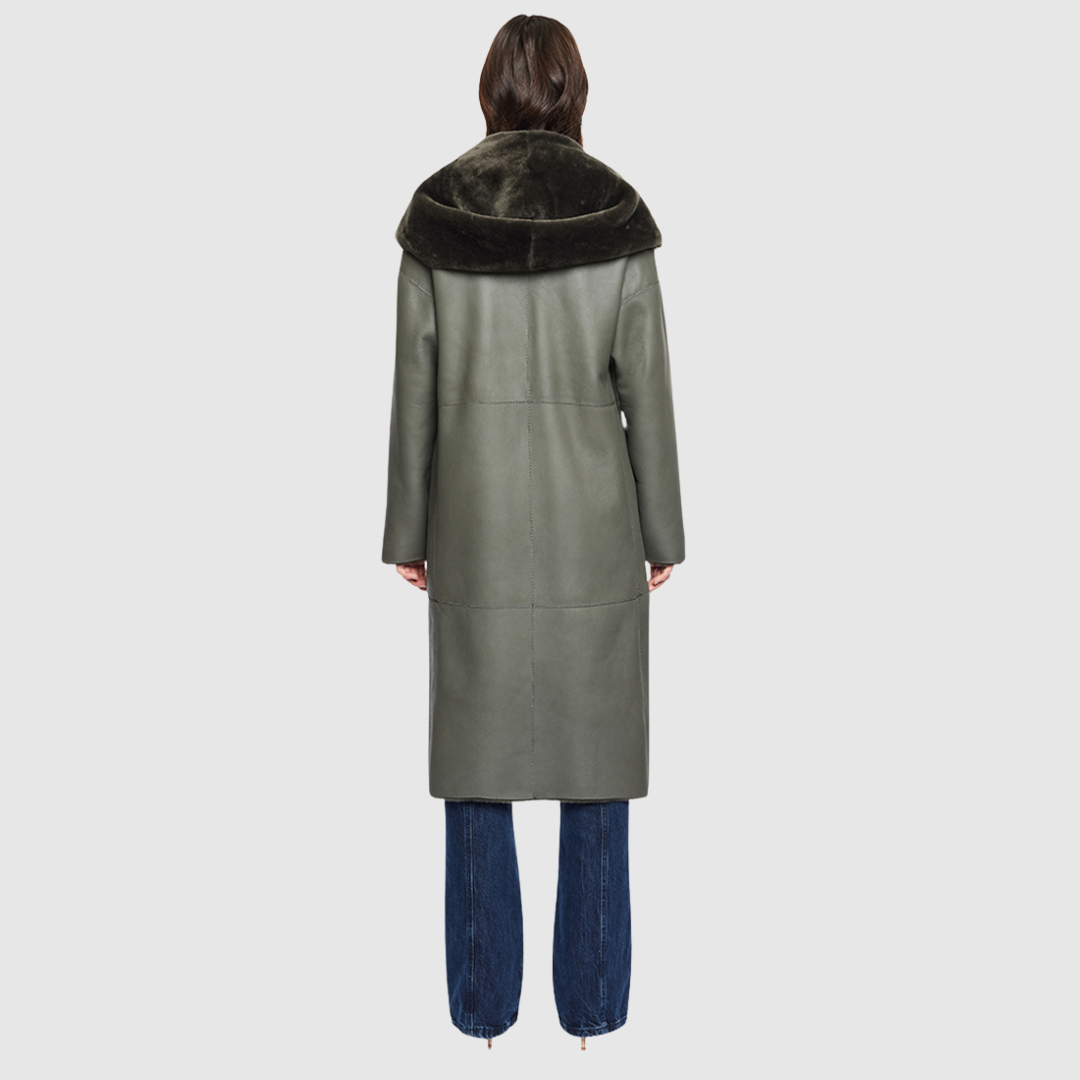 The EVER Reversible Shearling Coat is designed for maximum versatility and modern elegance. Crafted in khaki nappa that reverses to plush ironed wool, it offers two distinct styling options in one oversized silhouette. An oversized hood that converts to a dramatic shawl collar adds functional sophistication, while raw-edge finishing gives it a contemporary edge. With its drop shoulder and pull-through pockets, EVER is a refined statement piece perfect for heritage styling and après-ski layering.