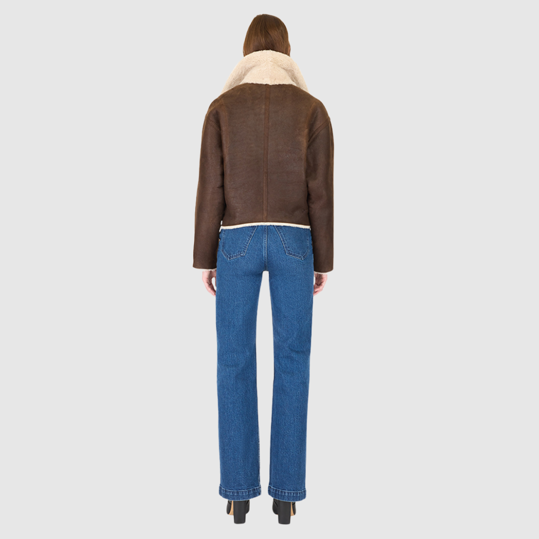 The ARIA Jacket is a luxury women’s shearling moto jacket designed with a reversible cropped silhouette that shifts effortlessly from sleek nappa leather to a plush curly wool teddy. With its drop shoulder and relaxed batwing sleeves, ARIA delivers an edgy yet easy fit that flatters every look. An oversized notch collar brings statement structure, while practical pockets on both sides and an asymmetrical front zip with single button closure ensure both style and function. A true modern reversible shearling jacket, ARIA is crafted for bold cold-weather styling.
