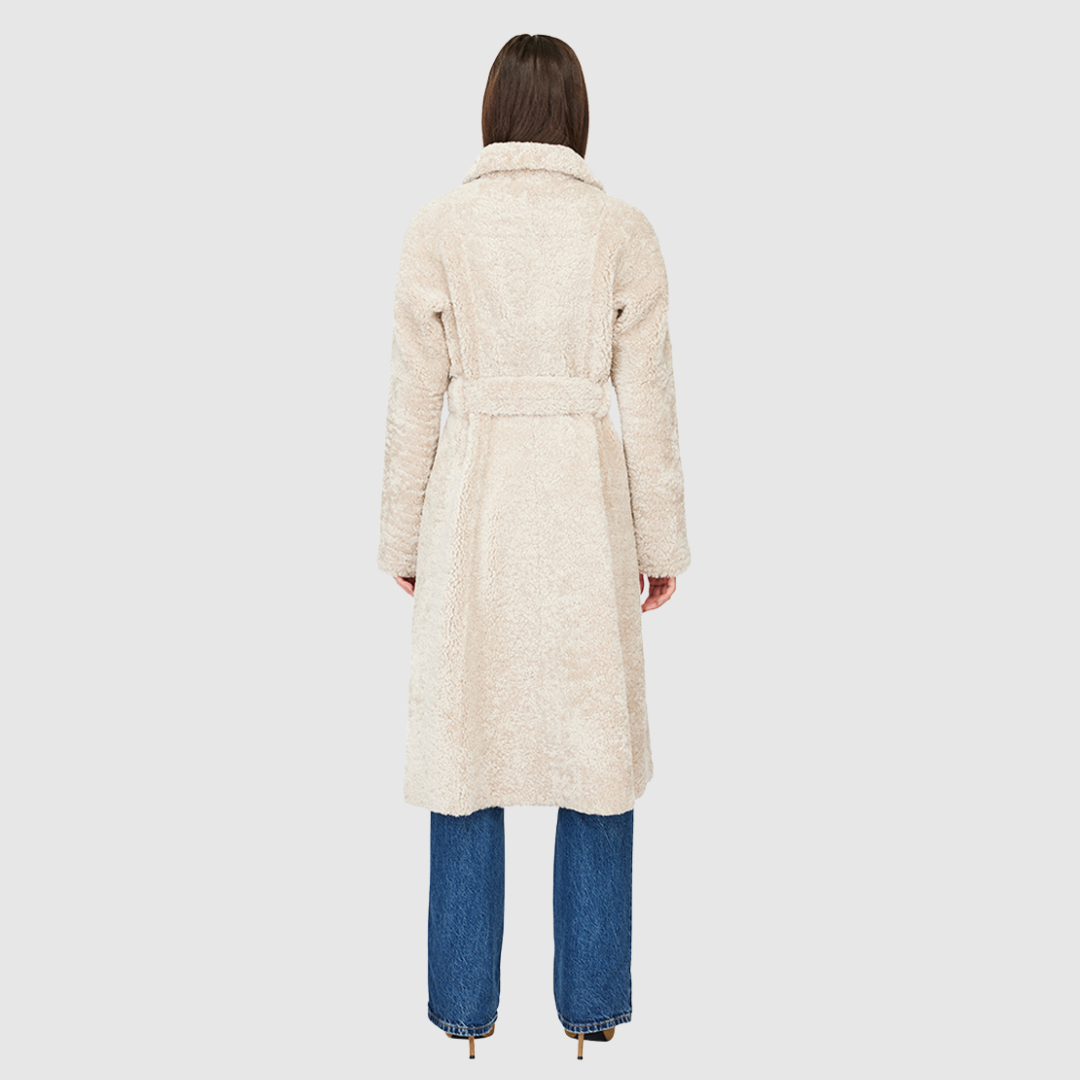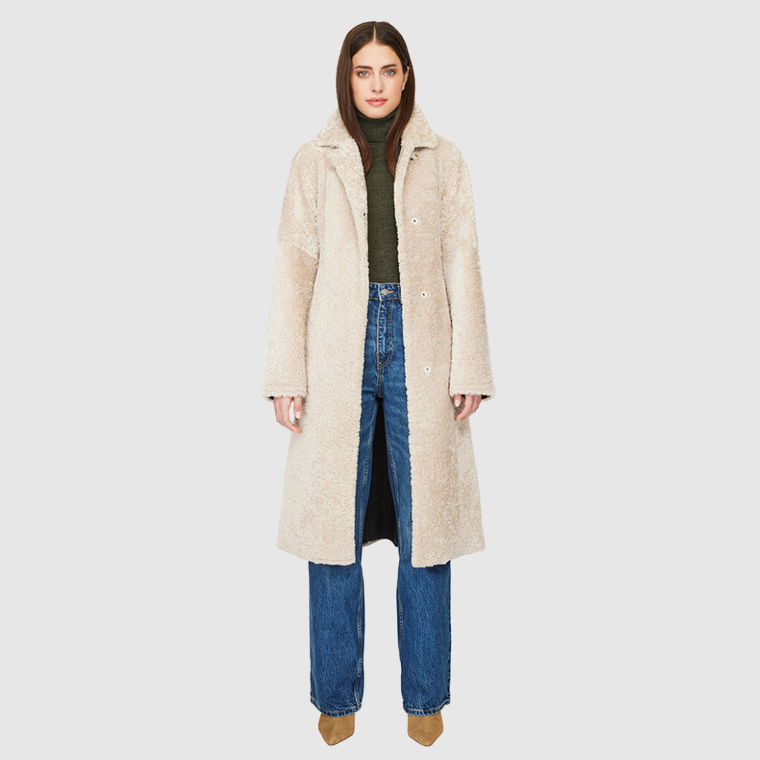 The HARLEY Shearling Coat brings a bold twist to classic outerwear with its striking bone mouton wool. Cut to a knee length with a fitted A-line silhouette, it offers a flattering shape while delivering heritage-level warmth. A notch collar and clean three-button front with a tie wrap closure add refined structure, while slash pockets provide everyday practicality. Designed for those who favor statement outerwear, HARLEY blends après-ski glamour with timeless sophistication.
