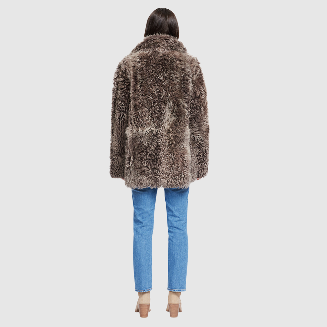 The MILKY WAY Jacket is a versatile statement piece crafted in brown ancient shearling, designed as a reversible teddy that flips to a suede skin-out jacket. It offers a relaxed fit when worn wool-out and a regular fit when worn skin-out. A spread collar adds structure, while slash side pockets on the teddy side and patch side pockets on the suede side provide functionality. Finished with a front button closure, MILKY WAY combines plush texture with sleek suede styling for modern cold-weather versatility.