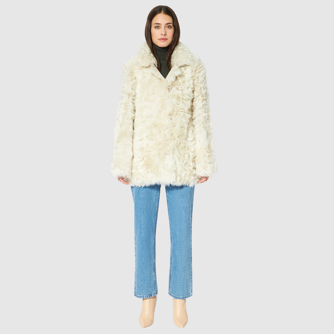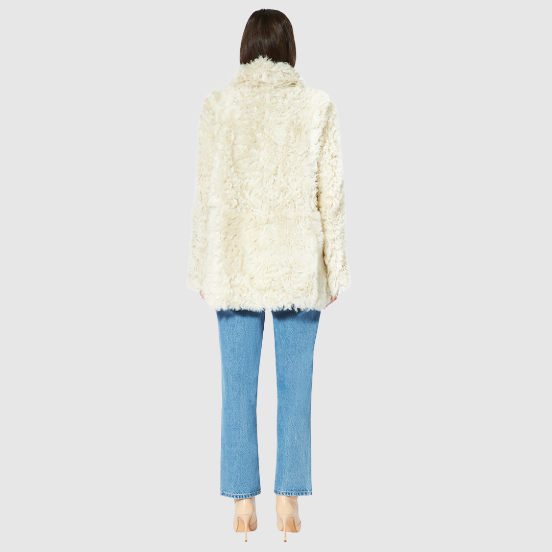 The MILKY WAY Jacket is a versatile statement piece crafted in macassar shearling, designed as a reversible teddy that flips to a nappa skin-out jacket. It offers a relaxed fit when worn wool-out and a regular fit when worn skin-out. A spread collar adds structure, while slash side pockets on the teddy side and patch side pockets on the nappa side provide functionality. Finished with a front button closure, MILKY WAY combines plush texture with sleek nappa styling for modern cold-weather versatility.