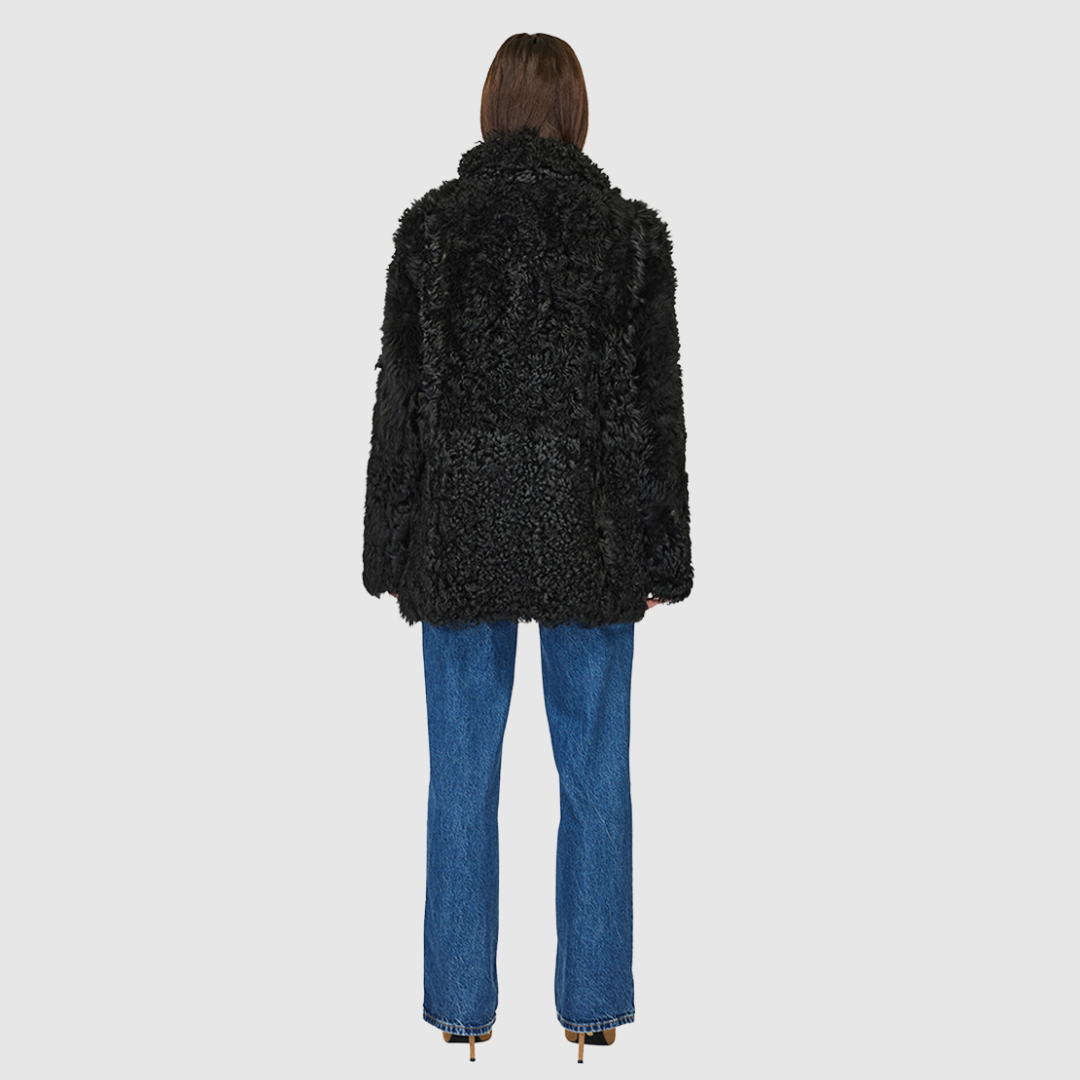 The MILKY WAY Jacket is a versatile statement piece crafted in jet shearling, designed as a reversible teddy that flips to a semi suede skin-out jacket. It offers a relaxed fit when worn wool-out and a regular fit when worn skin-out. A spread collar adds structure, while slash side pockets on the teddy side and patch side pockets on the nappa side provide functionality. Finished with a front button closure, MILKY WAY combines plush texture with sleek nappa styling for modern cold-weather versatility.