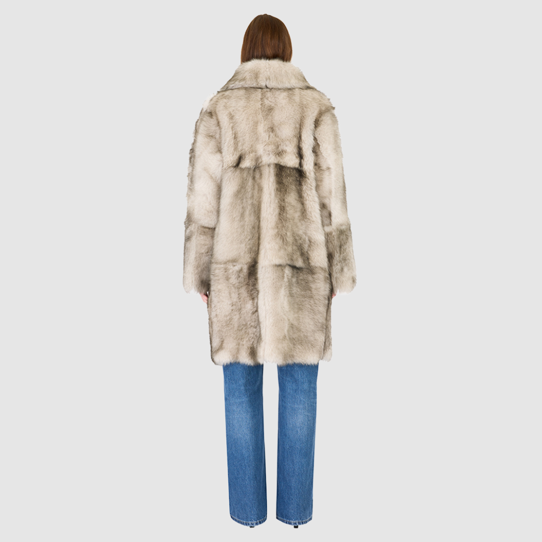 The JOY Jacket is a heritage-inspired reversible outerwear piece crafted in yingyang Toscana shearling. Designed to flip seamlessly from plush oversized teddy to sleek suede, it offers versatile styling for both après-ski sophistication and everyday winter elegance. With a drop shoulder, large notch collar, and oversized silhouette, JOY combines comfort with modern edge. Functional slash side pockets on the teddy side and single welt pockets on the nappa side, along with a front button closure, complete this luxury reversible shearling coat.