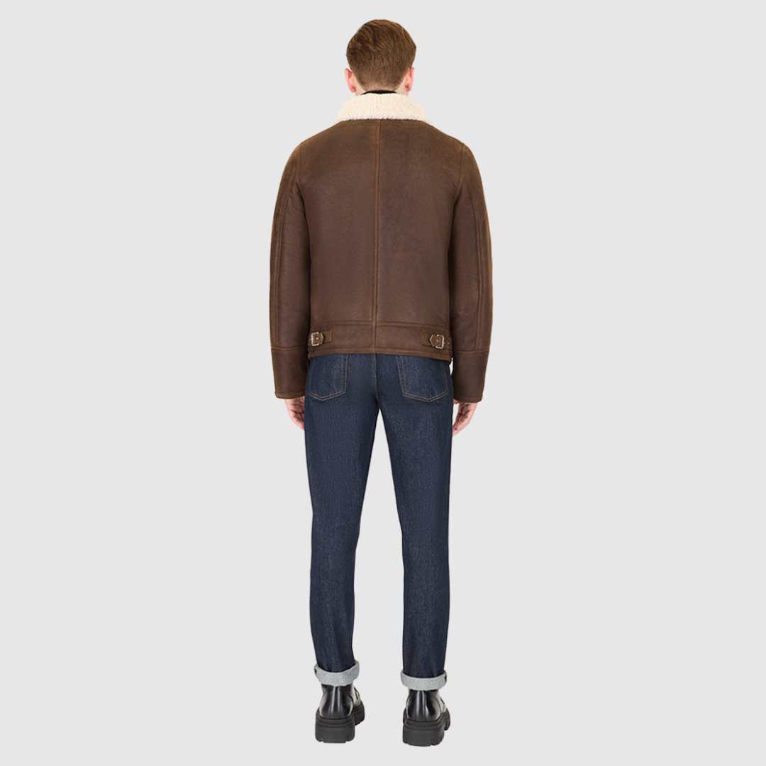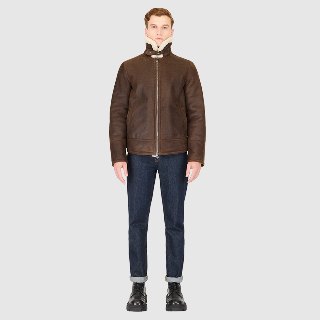 The Kane Brown Ancient Shearling Moto combines heritage craftsmanship with modern moto design. Crafted from supple nappa leather with a plush curly wool collar, it fits comfortably through the shoulders and chest for ease of movement. Featuring a notch collar with buckle detailing, interior patch pockets, and exterior single welt side pockets, it balances functional utility with polished style. A front zip closure completes the sleek, timeless silhouette.