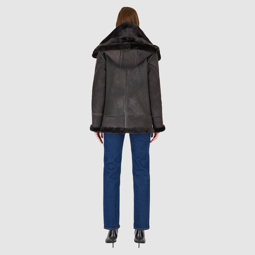 The MARTINA Jacket is a heritage-inspired medium-length shearling moto crafted in black vintage suede leather with curly wool collar and trims for elevated texture and warmth. Its relaxed fit with dropped shoulders ensures a modern, effortless silhouette, while the removable hood adds versatility for changing weather. Practical hidden interior pockets, exterior side zip pockets, and an asymmetrical front zip closure combine function with luxe design, making MARTINA ideal for après-ski layering or citywear.