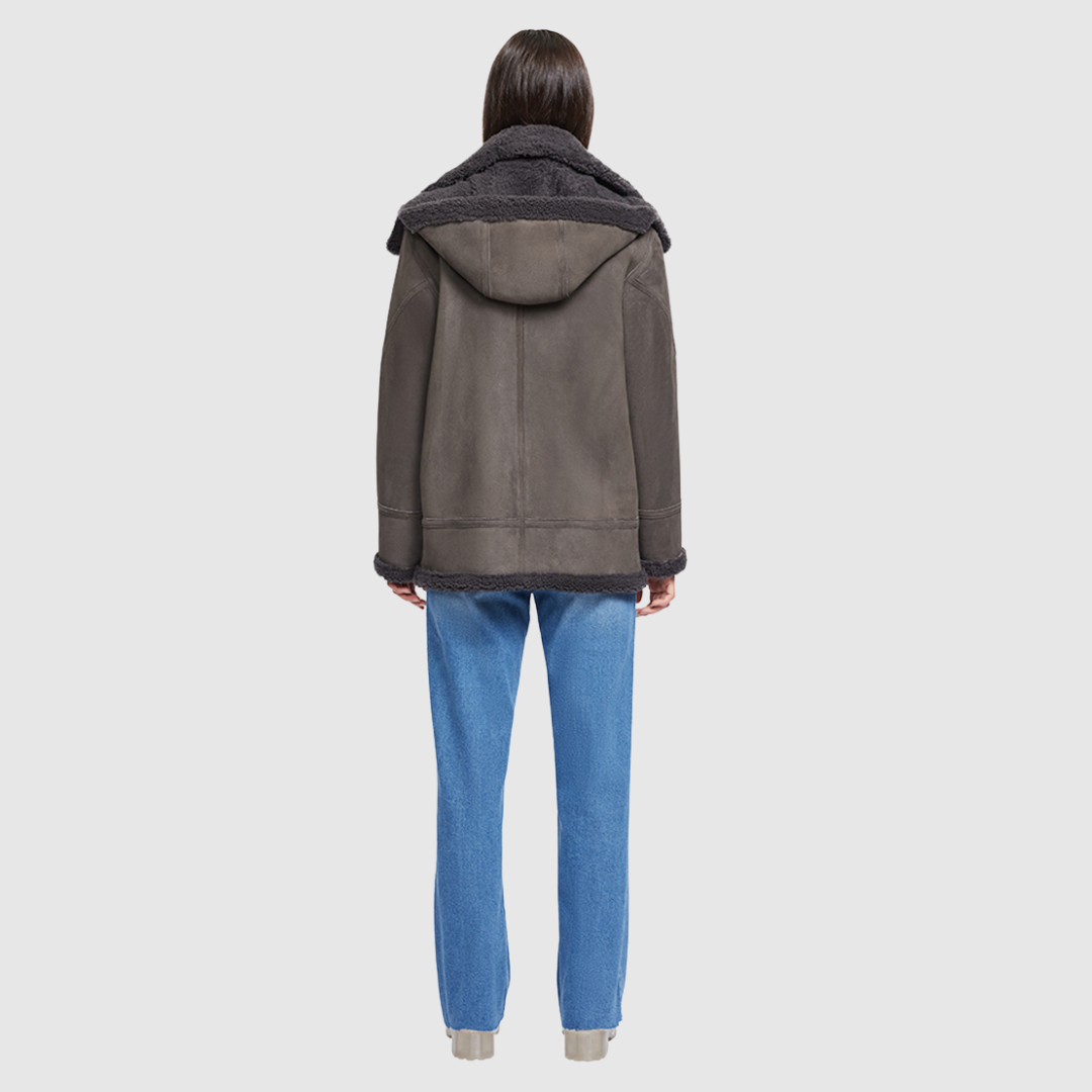 The MARTINA Jacket is a heritage-inspired medium-length shearling moto crafted in cappuccino suede leather with curly wool collar and trims for elevated texture and warmth. Its relaxed fit with dropped shoulders ensures a modern, effortless silhouette, while the removable hood adds versatility for changing weather. Practical hidden interior pockets, exterior side zip pockets, and an asymmetrical front zip closure combine function with luxe design, making MARTINA ideal for après-ski layering or citywear.