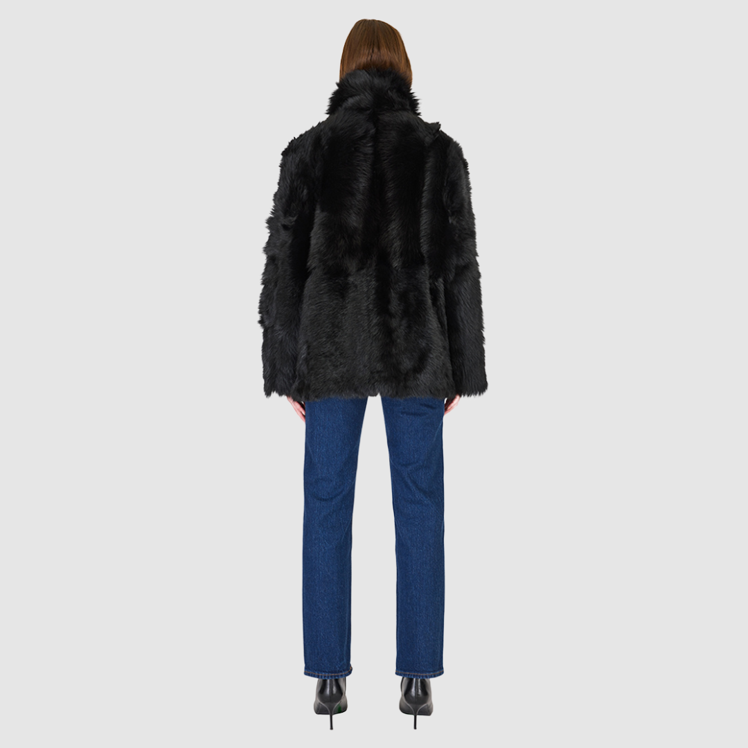 The MILKY WAY Jacket is a versatile statement piece crafted in Jet Toscana shearling, designed as a reversible teddy that flips to a nappa skin-out jacket. It offers a relaxed fit when worn wool-out and a regular fit when worn skin-out. A spread collar adds structure, while slash side pockets on the teddy side and patch side pockets on the nappa side provide functionality. Finished with a front button closure, MILKY WAY combines plush texture with sleek nappa styling for modern cold-weather versatility.