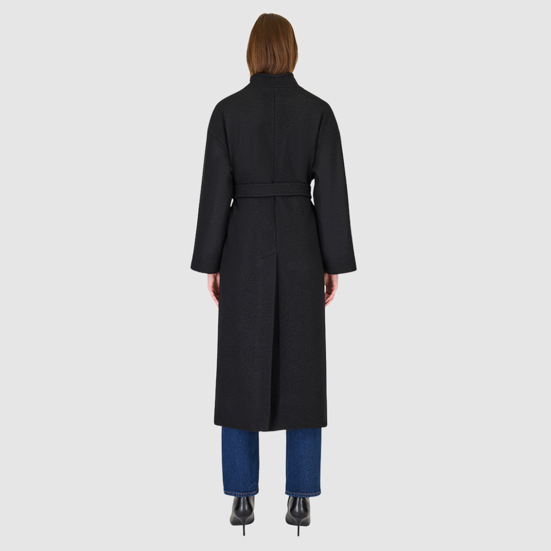The Petra Taupe Boiled Wool Coat is crafted from premium Italian boiled wool, offering warmth, structure, and effortless sophistication. Designed as an oversized wrap silhouette, it features a tie belt for adjustable styling, drop shoulders for a relaxed drape, and a modern stand collar. Finished with discreet single welt side pockets, this coat balances timeless tailoring with contemporary ease—perfect for versatile cold-weather layering.