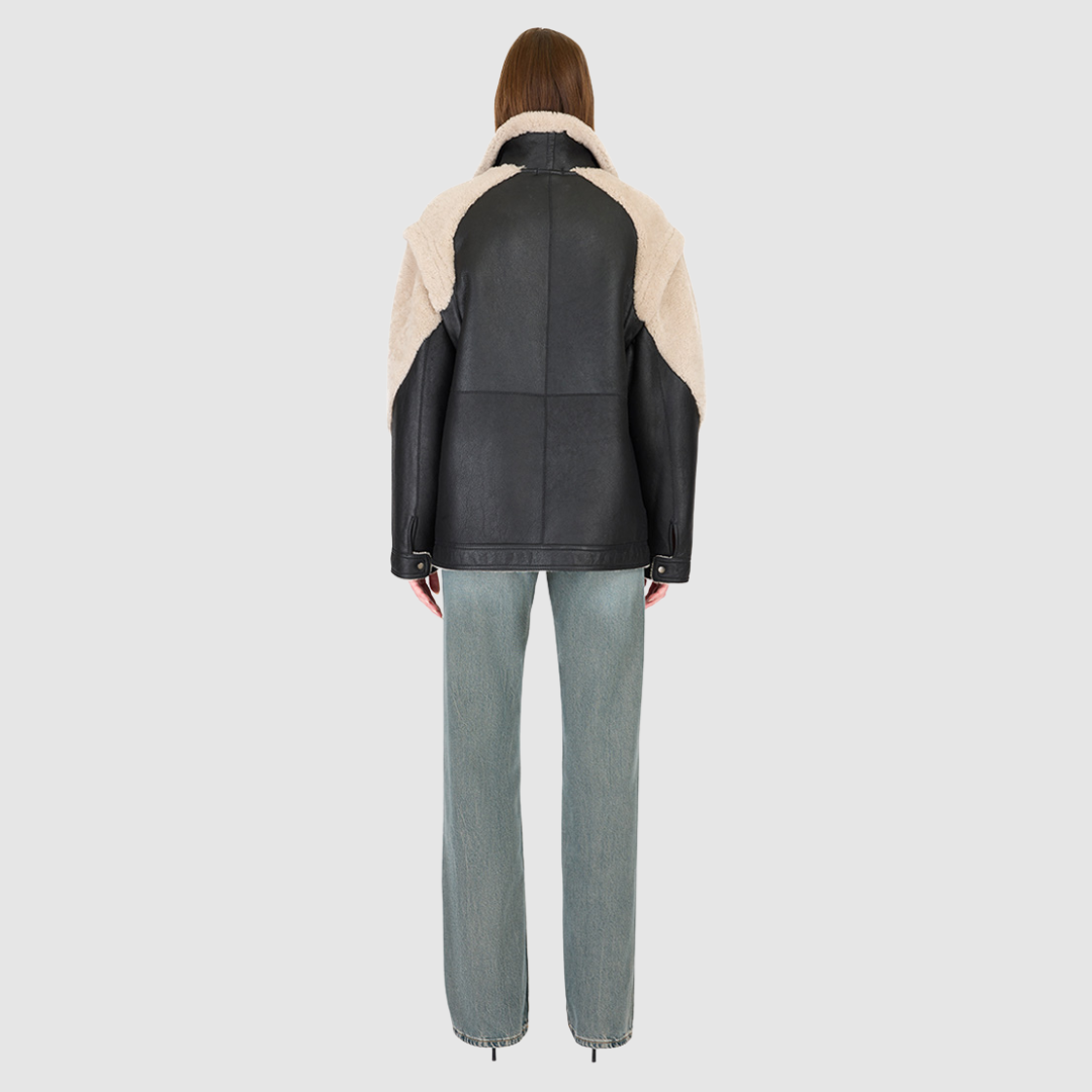 The SOLO Black Beige Moto Jacket redefines versatility with a bold mixed-media design that fuses supple nappa leather and plush curly wool shearling. Designed with a relaxed fit through the shoulders, arms, and torso, this statement jacket easily converts into a vest with removable zip sleeves for year-round styling. The curly wool collar, shoulders, and sleeves bring rich texture, while the stand collar and moto-inspired hardware emphasize its urban edge. Finished with single welt side flap pockets and a front zip with snap closure, SOLO is a standout layer that embodies both function and fashion.