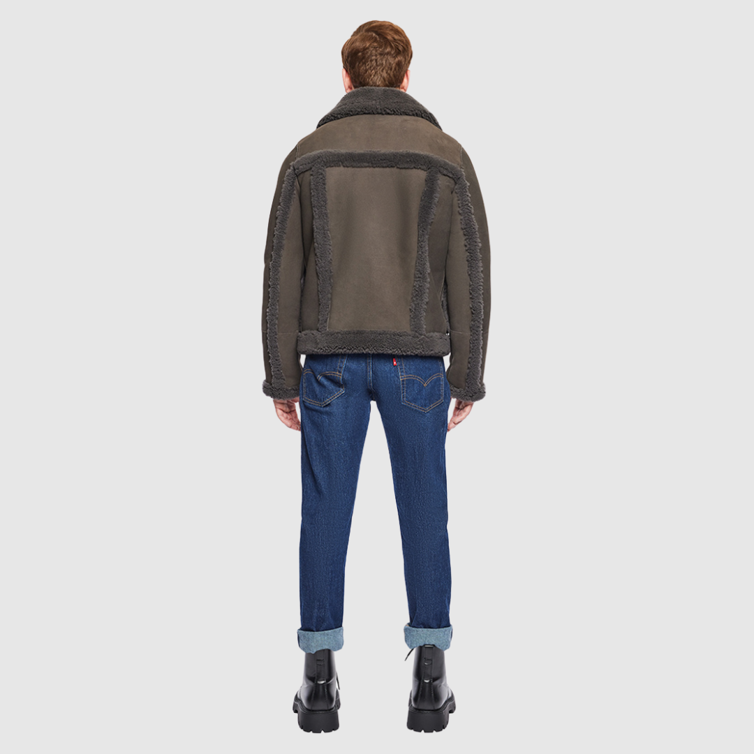 - Men’s mixed-media suede shearling jacket