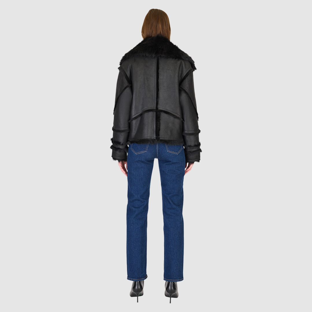 The VENUS moto shearling Jacket is a modern interpretation of the classic moto, crafted in supple nappa leather with Toscana wool-out seam detailing. Its drop-shoulder silhouette adds effortless ease, while the spread Toscana collar with buckle detail delivers a bold, statement finish. Designed for both form and function, VENUS features interior and exterior zip pockets to secure essentials. A front snap closure completes this sleek, cold-weather essential with understated edge.
